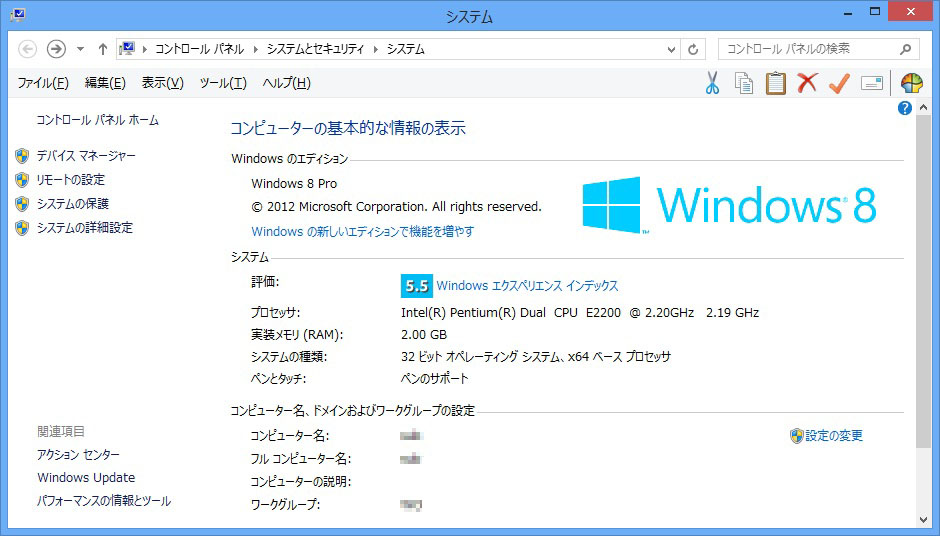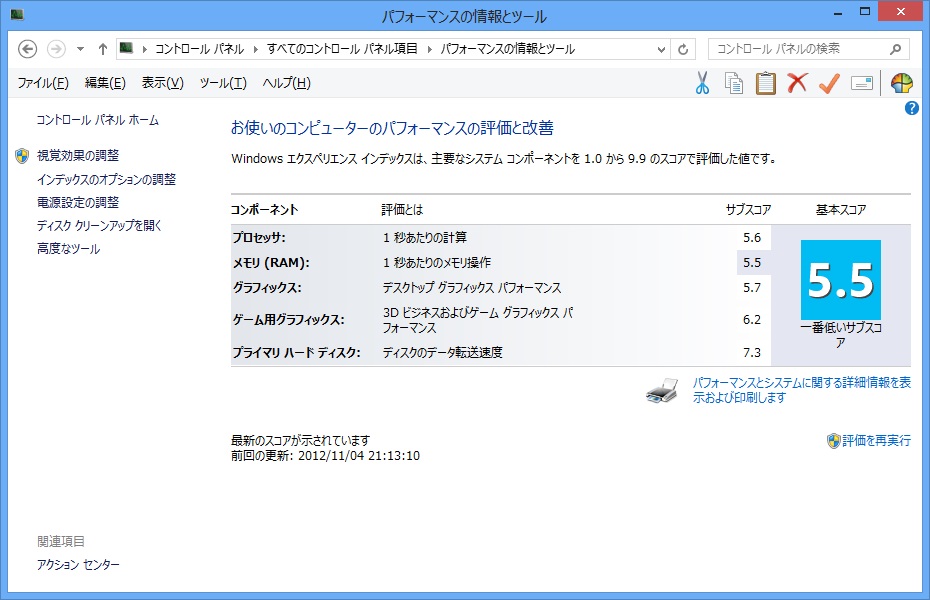 サブ機(Pentium DC E2200+DDR2 2GB)なのでスコアはそれほど高くありませんが、ディスクのデータ転送はSSD化恩恵を受け7.3となかなかのスコアが出ました。