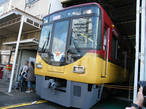 8000系新塗装で、座席表面の材質も8000系と同じようで、京阪の拘りが感じられます。