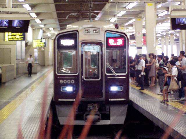 阪急9000系の「9000」は記念すべきトップナンバーですね。この「9000」の裏はトップ画像にもあって、みたまんま「9100」。一方の先頭車の貫通ドアにある数字がわかればもう一方の数字も分かると。例をあげると「6102」とすればもう一方は「6002」という感じでしょうか。